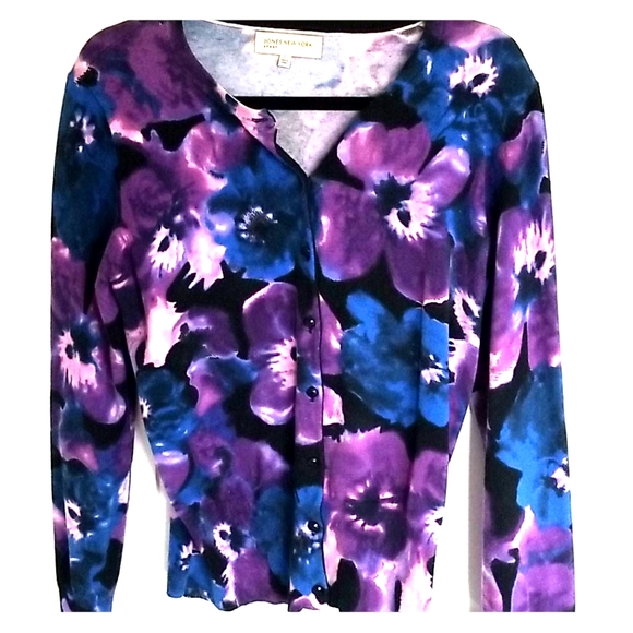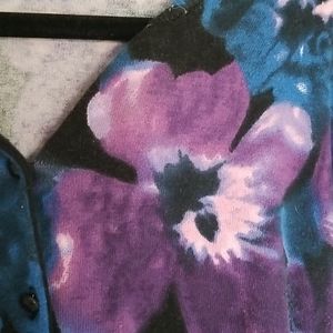 Violet and blue flowered cardigan with black buttons. Soft as Angora. But cotton.