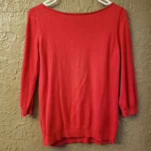 Boat neck red sweater with collar detail on front.