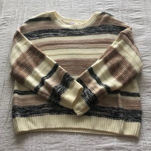 Size medium striped sweater. The colors are cream, black, and light pink. Never worn with tags still on!