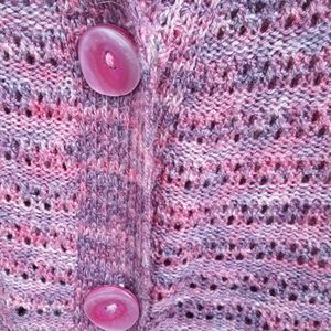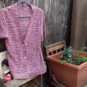 Hand knit short sleeves in the prettiest pinks, purples together in a delicate hand made sweater. Very light and airy to use for dainty layering. Large pink snap buttons.