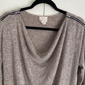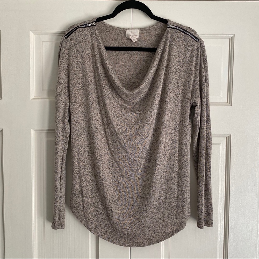 Very cute & comfortable. Great to dress up or dress casual. Simple zipper details by the collar bones. Cowl neck.