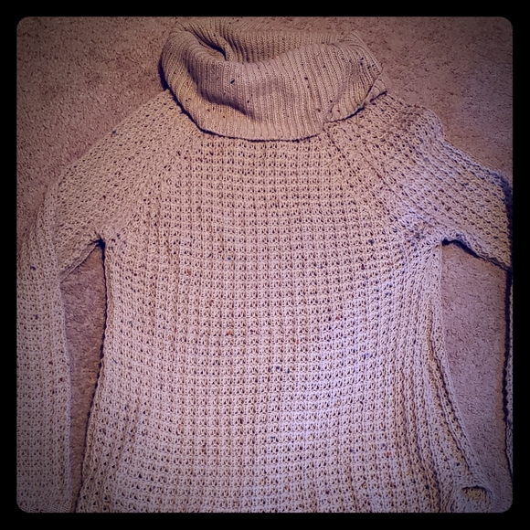 Tan sweater with multiple color stitches. Perfect for wearing over a cami. Longer, great with leggings. Covers the bum.