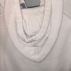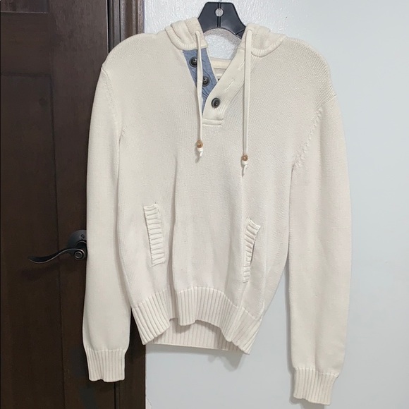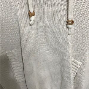 A thick cream colored sweater. It’s great for the fall. It has two pockets on the front and a hoodie on the back.
