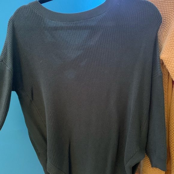 Olive green sweater with three quarter length sleeves and cross cross design in the back