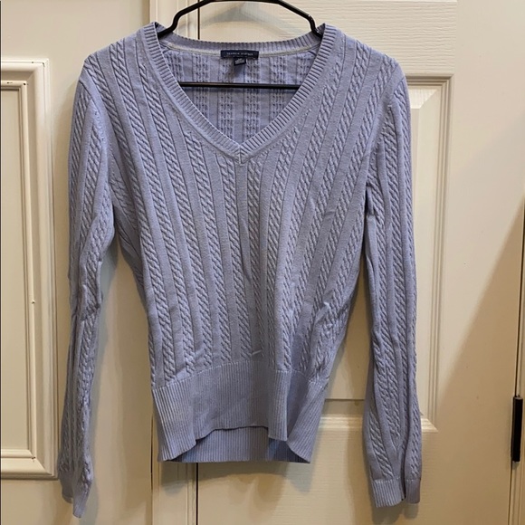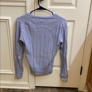 Light blue Tommy Hilfiger sweater. Minor discoloration at bottom and both elbows. Fitted.