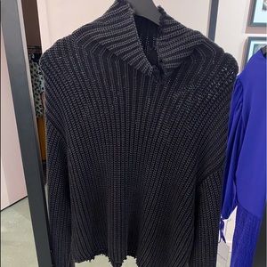 Deconstructed edges on sleeves and turtle neck