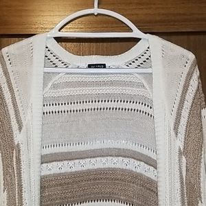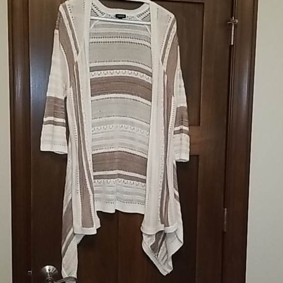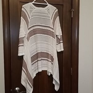 Knit light weight sweater with 3/4 length sleeves. Ther is a small snag in the back if the sweater and the size is a 2X but it fits more like a 1X. Colors are cream, tan and brown.