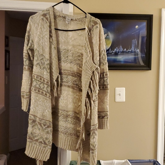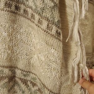 Long sleeve knitted, tan, brown, white, green sweater with sparkles and fringe on inside.