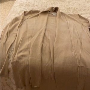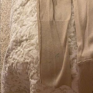 Tan sweater, open in the front, has a small pen mark on the right sleeve.