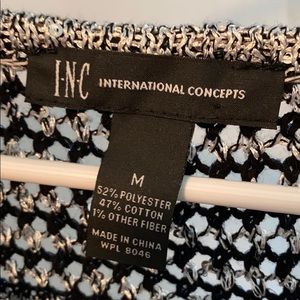 Black and silver striped 3/4 sleeve sweater with slanted edging on the bottom.