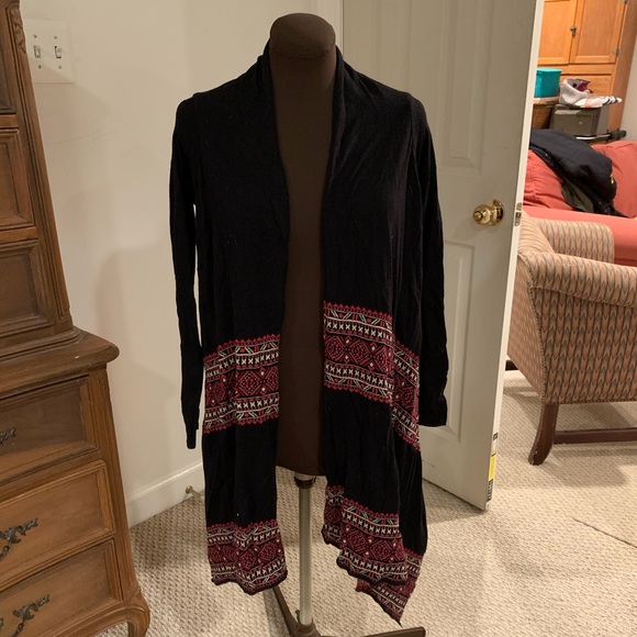 Black cardigan with pink and beige design around middle and bottom. Size small. Good condition!