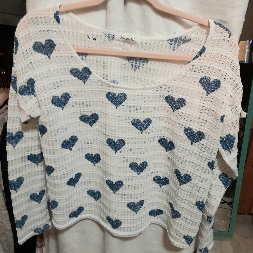 Blue and white thin sweater with hearts on it.