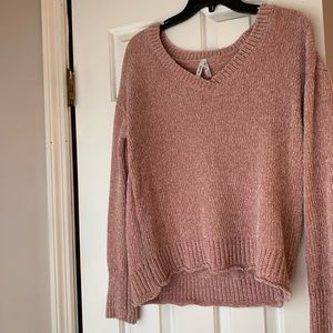 Blush colored sweater. Material is super soft. The neck is quite wide and the sleeves are tight.