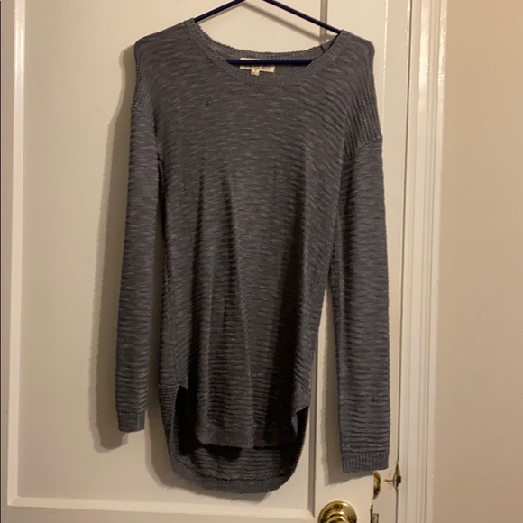 Gray sweater. Long in the back and somewhat loose fitting. Great to just wear if you need to throw it on with leggings