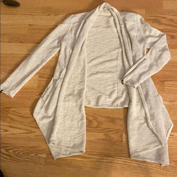 White and silver sweater. Has pockets and sleeves have zippers on the end.