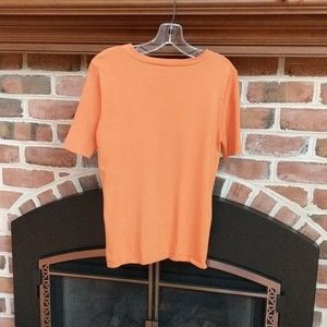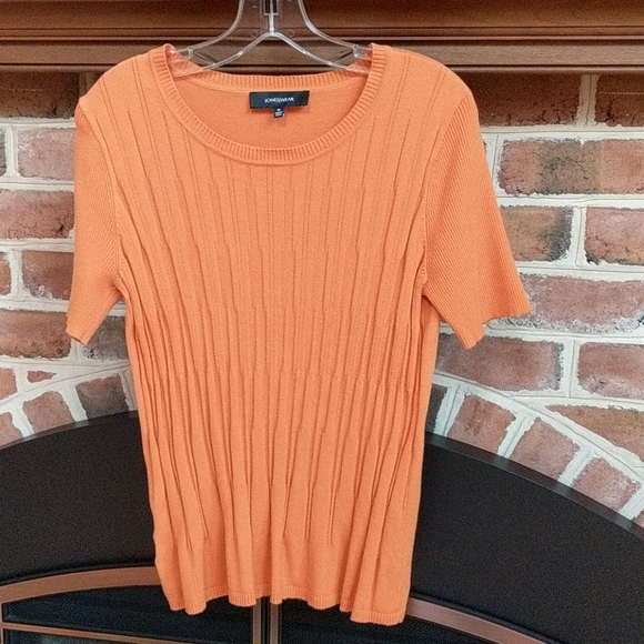 Perfect for fall! Jones Wear orange sweater. Rounded neck. Sleeves are 9 in long. Shoulder to bottom is 24 in. Funky ribbed. Excellent condition non-smoking home.