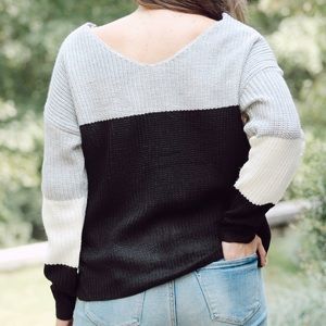 Black, cream, and gray sweater with twist front detail. Can be worn with the twist in back as well! True to size. Happy to provide measurements upon request! ๐