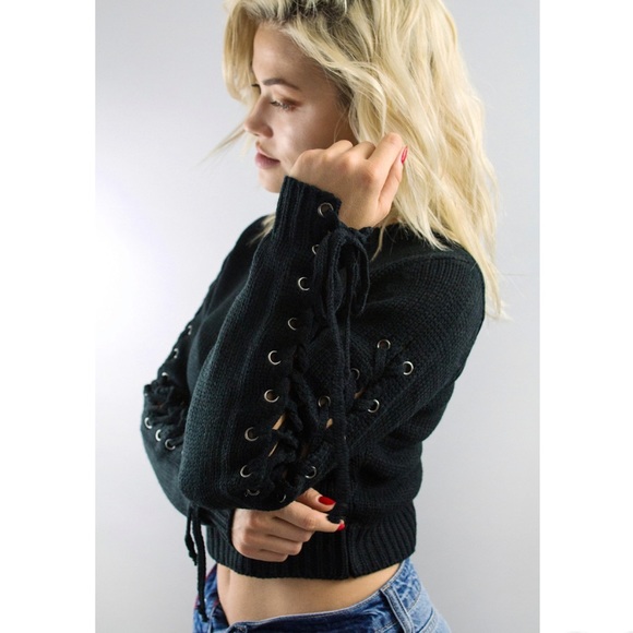 This cropped sweater adds a bold twist with the lace-up sleeve detail and oversized polished grommets. Paired with boyfriend jeans and stilettos, this look weaves together the edgy with the delicate.