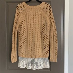 Light brown sweater with lace detail at the bottom. This sweater is higher in the front and longer in the back. It is warm but still breathable.