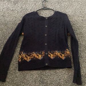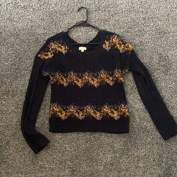 Dark Blue knitted sweater with orange, yellow, and light blue knitted accent pattern