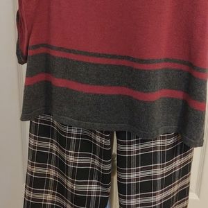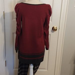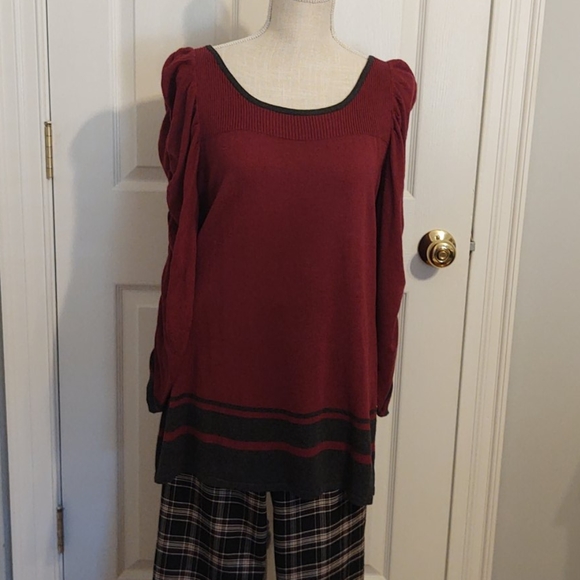 Sophie Max cotton/rayon tunic sweater with scoop neck. Fairly lightweight and soft. Long sleeves are gathered. Cranberry with charcoal gray stripes around the bottom. Bundle and save!