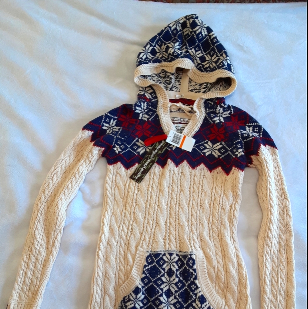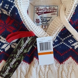 Super dry black label sportswear with blue/red/tan design. Hooded sweater