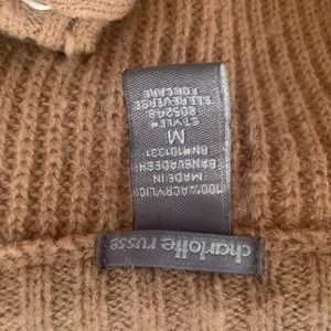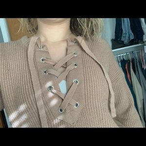 Brown/tan sweater crossed neckline. Size medium, but I’m normally a small. perfect for the holidays!