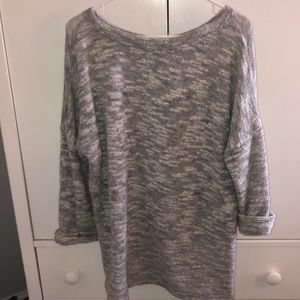 White and grey sweater, shorter in the front a little longer in the back.