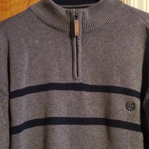Gray sweater with navy blue stripes and zip up neckline. 32" long.