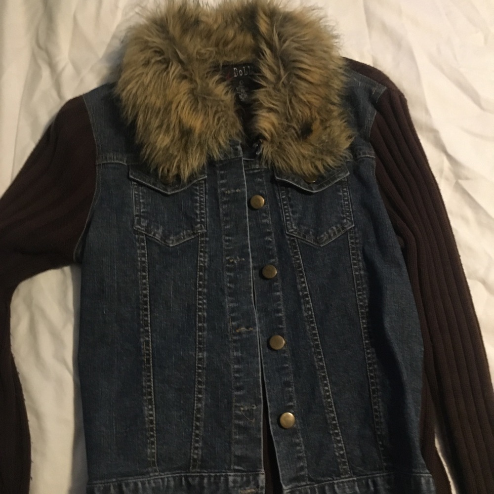 Denim and brown sweater