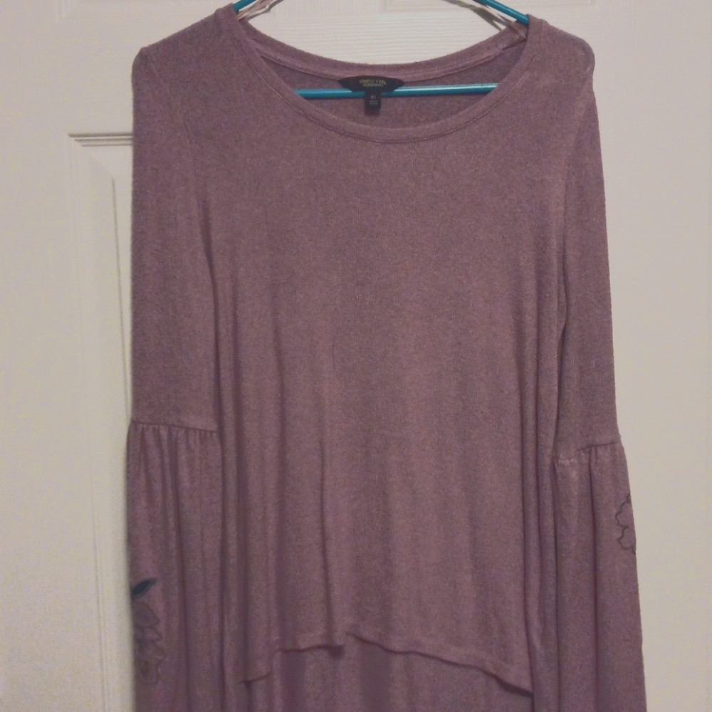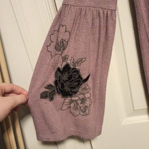 Rose colored sweater. Bell sleeves with black and grey rose embroidery on them and a scoop neck