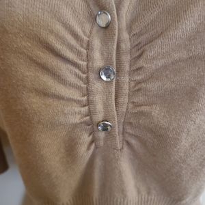 Beautifully rich tan sweater with ruching on arms and studded button detail in front. V-neck adds a sexy flavor to this sweater and the sweater material gives it a flattering fit. Will look great with your favorite denim jeans or with a nice pair of dress pants.