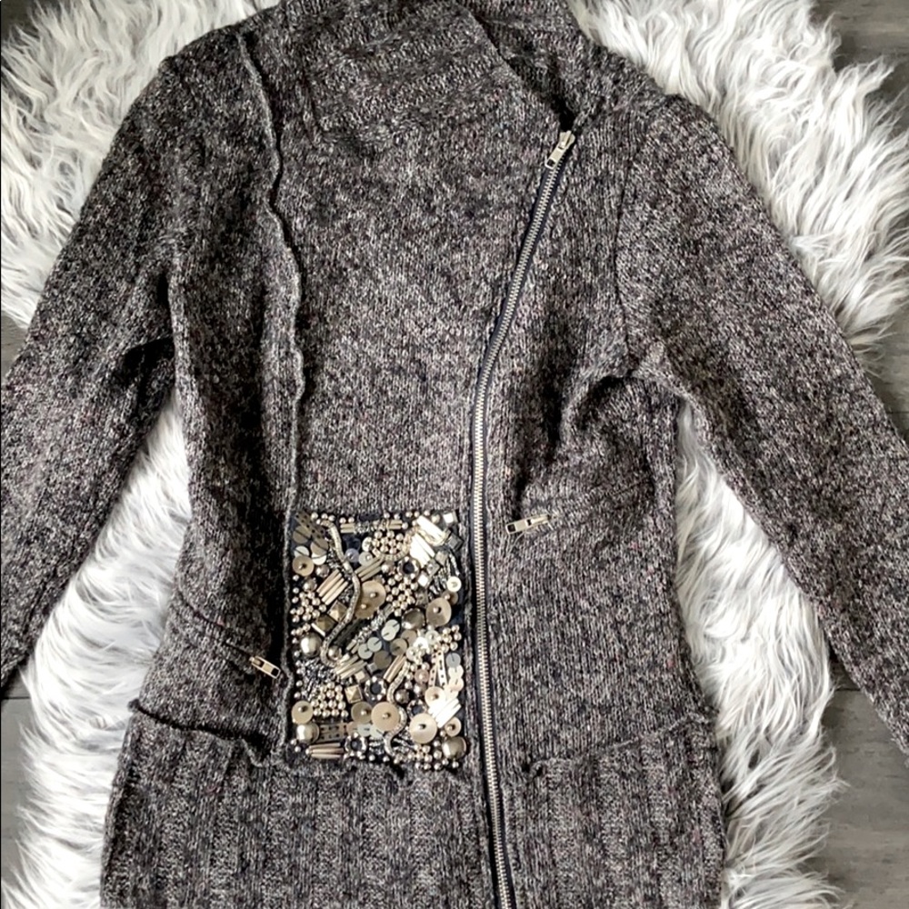 Very unique motor-style sweater with beautiful details. One of a kind. Super soft material: acrylic, polyester and cotton. Super warm. Neck can be folded or worn high. Size M