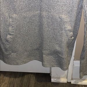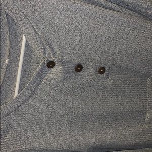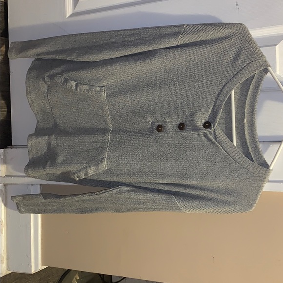 Thin, grey, 3 button sweater with front pocket. All three of the buttons come undone