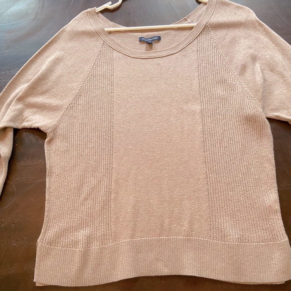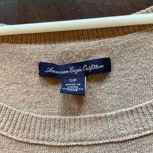 Lightweight tan american eagle sweater. Is a size small but fits more like a bigger small or small medium (if that makes sense? Lol) !