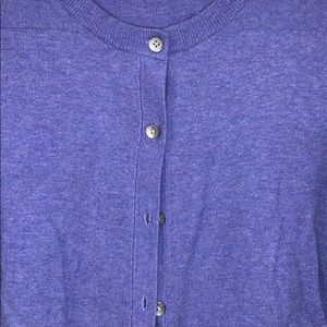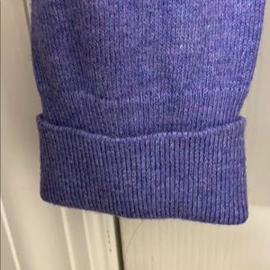 It is a purple blue sweater. Warm and has buttons up the front of it. I have shorter arms so i rolled up the sleeves, but can unroll them! It is a scoop neck line. Only worn twice.