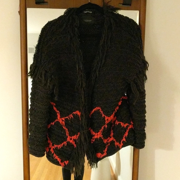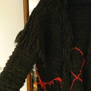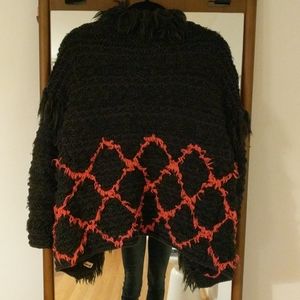 Edgy fringe Sweater, Hot Pink Diamond Pattern around lower half, fringe on shoulder/sleeve area as well as around collar. Very warm.