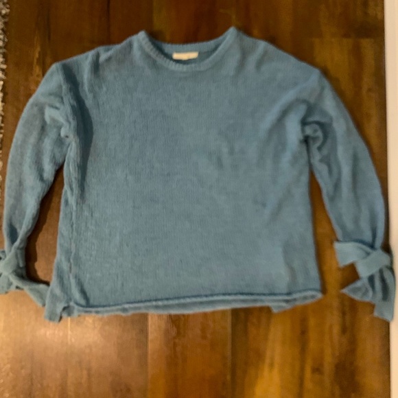 Soft teal sweater with ties at the wrist
