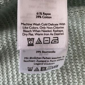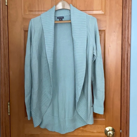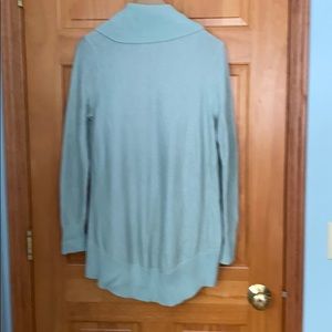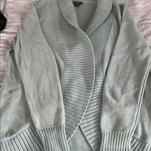 Mint green, shawl collar sweater, no stains or snags. The back measures 30in long.