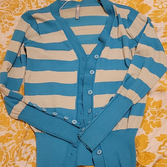 Blue and gray sweater with buttons in front and on sleeves