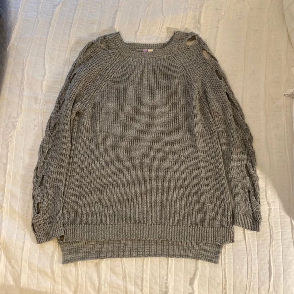 Grey knit sweater with cutouts on both sleeves. Alya size medium Goes great with a pair of jeans or leggings!