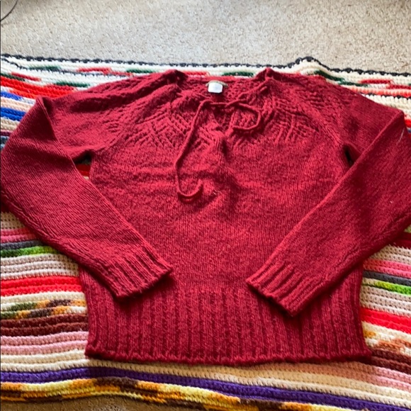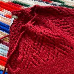 Crimson red sweater, detail around shoulders and neck. Never worn