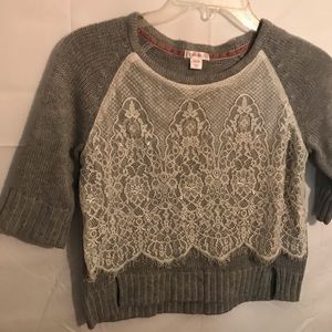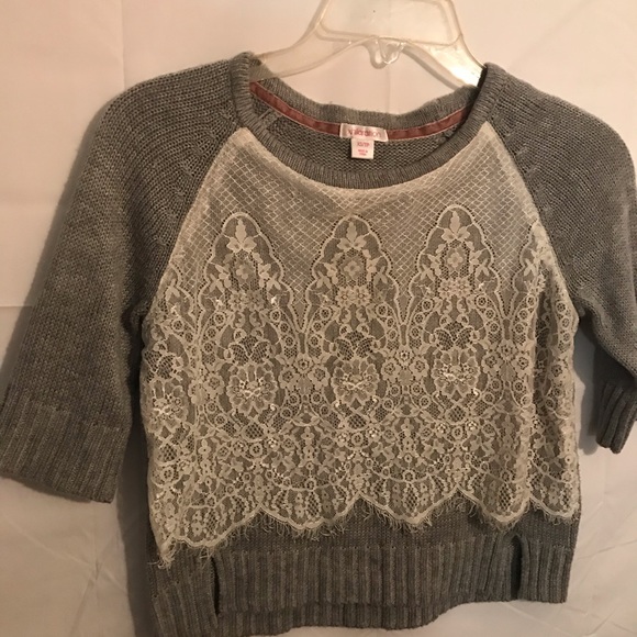 Lace front, sleeves 15’ split on side, sweater length 20,round neck, material-nylon/polyester/rayon.