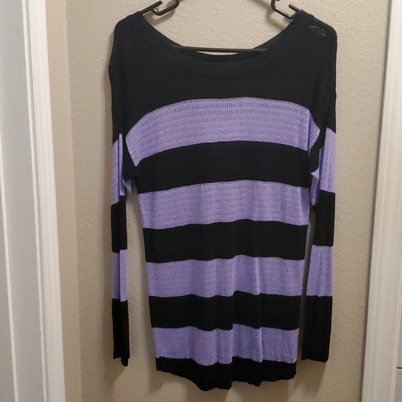 Black and lavender striped sweater with buttons down the back. 100% Rayon so very lightweight sweater.