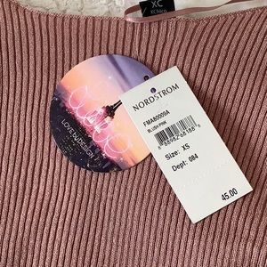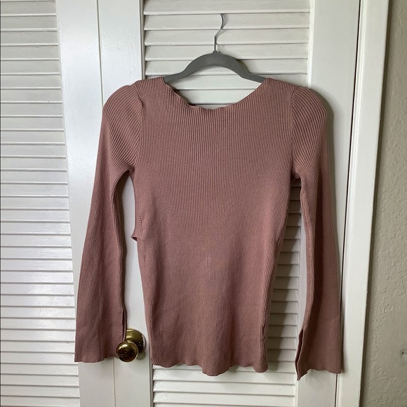 Light weight ribbed dusty rose sweater with a split back and slit flared sleeves