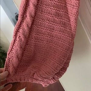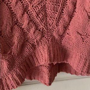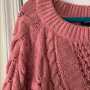 This sweater is extremely soft and comfy. It falls at the hip and has balloon sleeves. It is a pink rose color