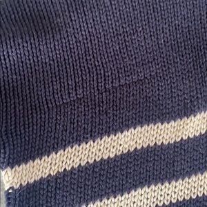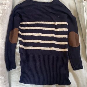 Blue and white stripped sweater from Francesca’s. Longer in the back, brown detail on elbows. Very classic sweater