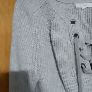 Grey sweater flare-up has a small flair to the lower arms eyelets where it laces up