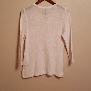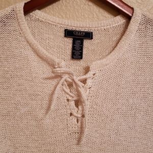 Classic ivory color Chaps sweater. 3/4 length sleeves. Beautiful detail with tie neckline.