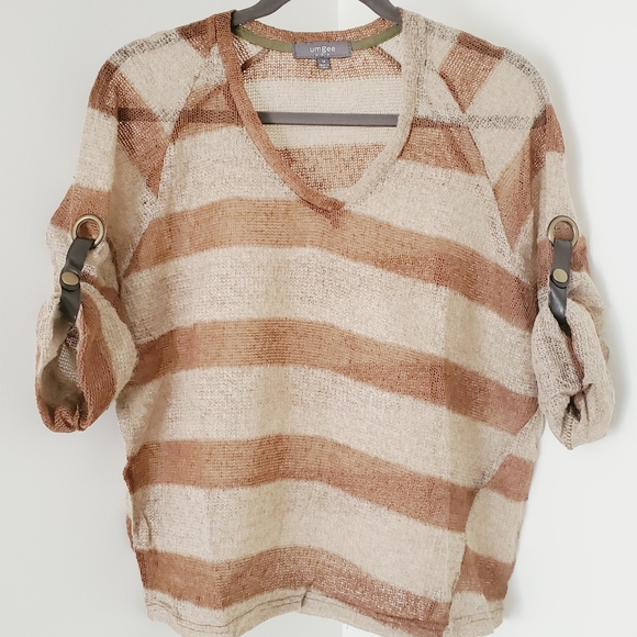 Camel color, striped umgee sweater. Faux leather straps holding up sleeves.